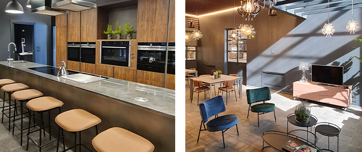 The showroom is a sleek and modern space that exudes Italian design aesthetics. Clean lines, minimalistic decor, and a sophisticated color palette create an inviting and visually pleasing environment.